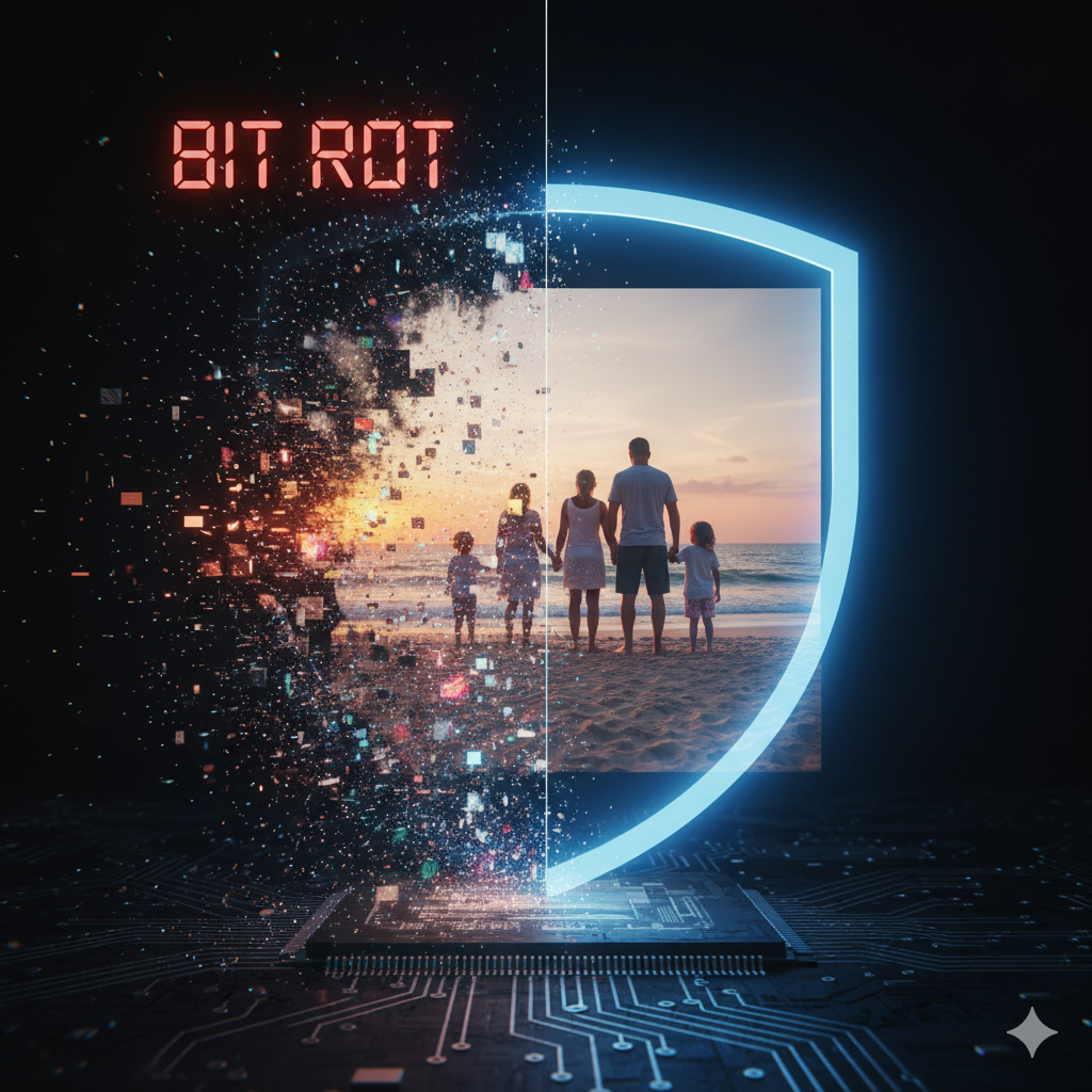 Se o seu disco rígido inverter um único bit (de 0 para 1) devido a radiação cósmica ou desgaste magnético, o Ext4 não vai perceber. Ele vai ler o arquivo corrompido, entregar para sua aplicação, e você só vai descobrir quando tentar abrir aquela foto de família daqui a 5 anos e ela estiver cinza pela metade. Isso se chama Bit Rot (Apodrecimento de Bits).